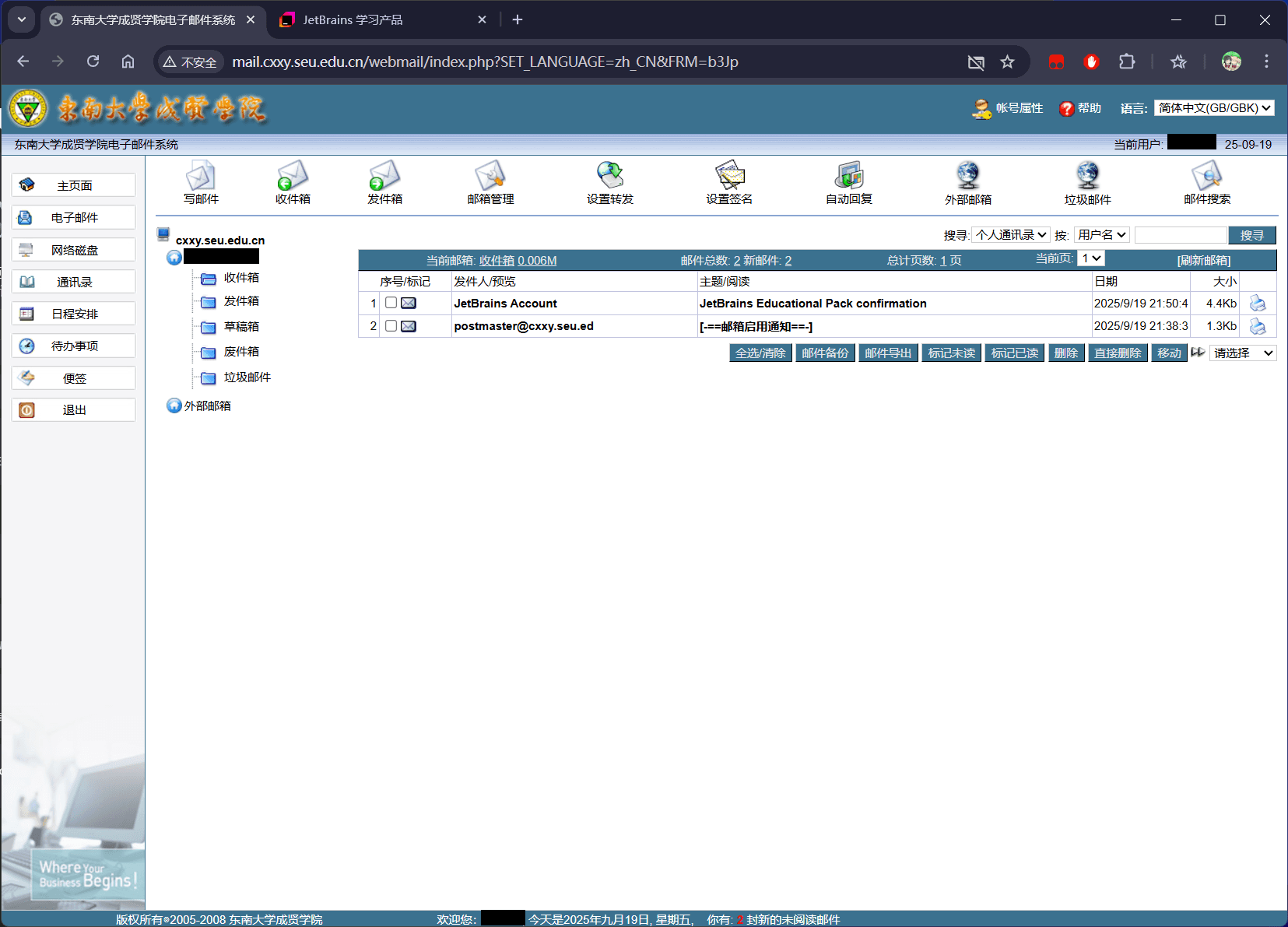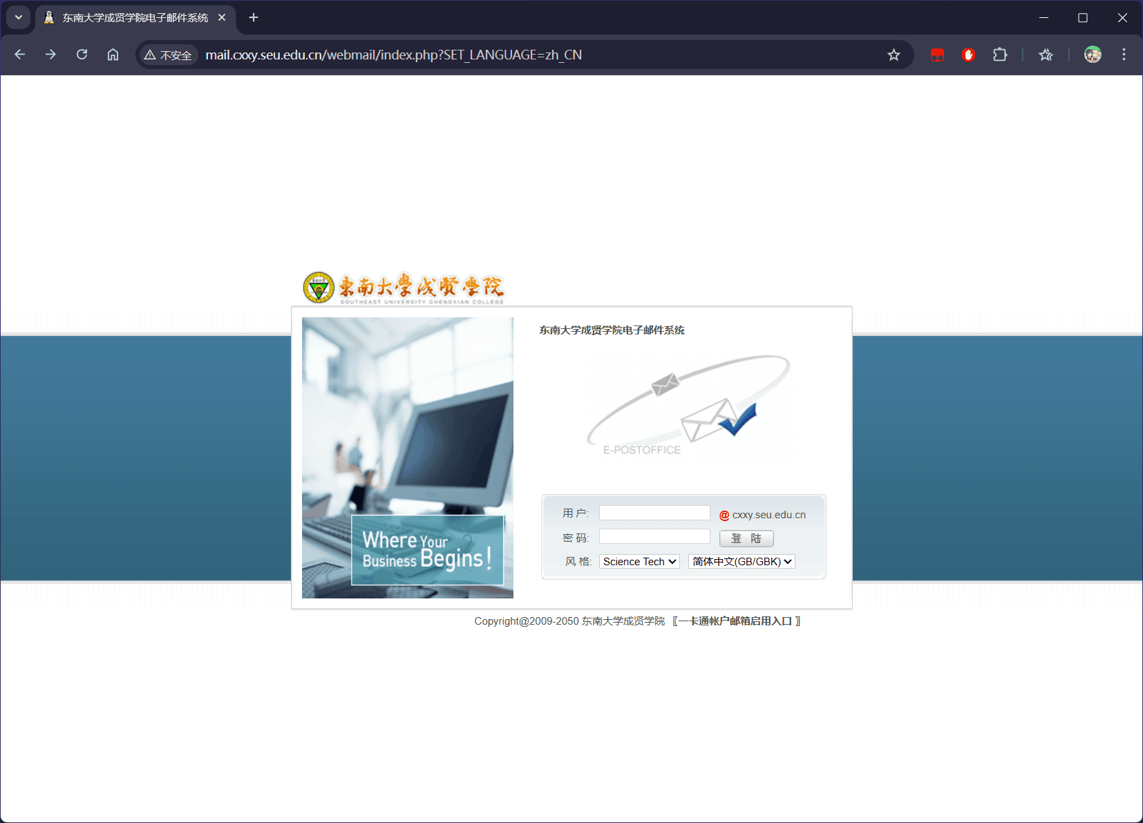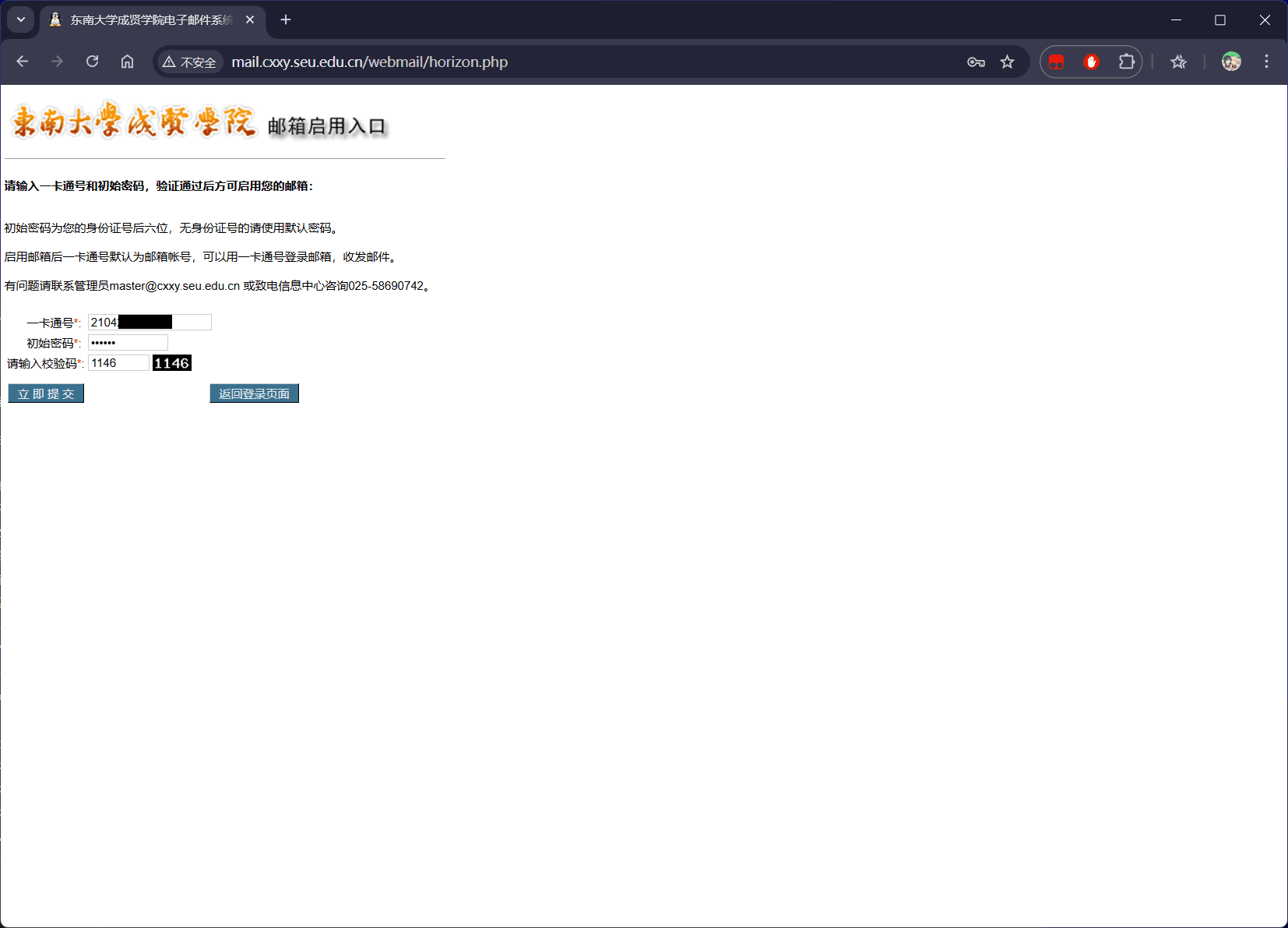 登陆学校邮箱官网 http://mail.cxxy.seu.edu.cn,点击下方 一卡通帐户邮箱启用入口。