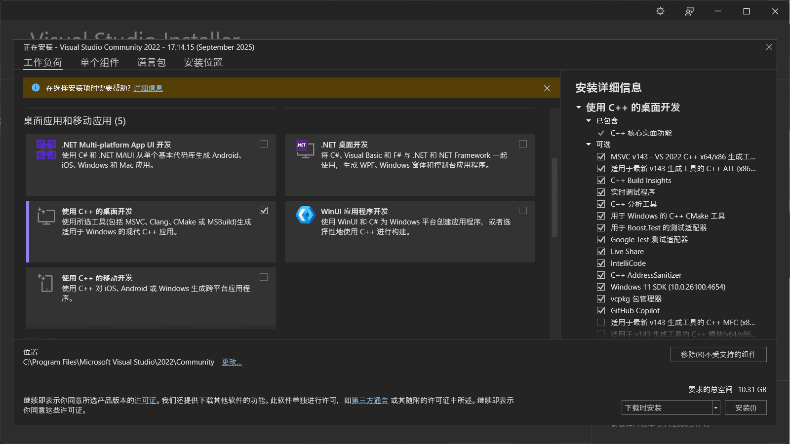 滚到下方,选中 使用 C++ 的桌面开发,然后根据需求更改安装位置,点击右下角安装开始安装。