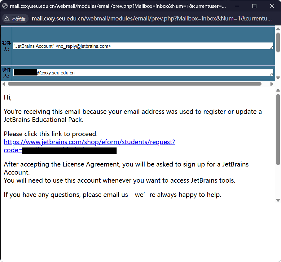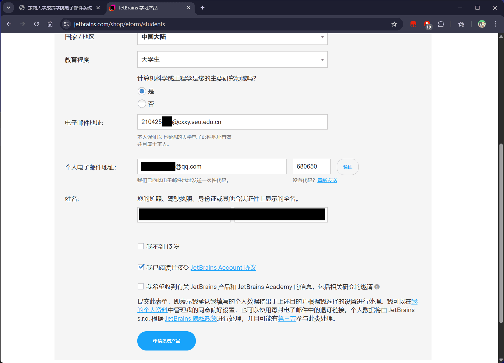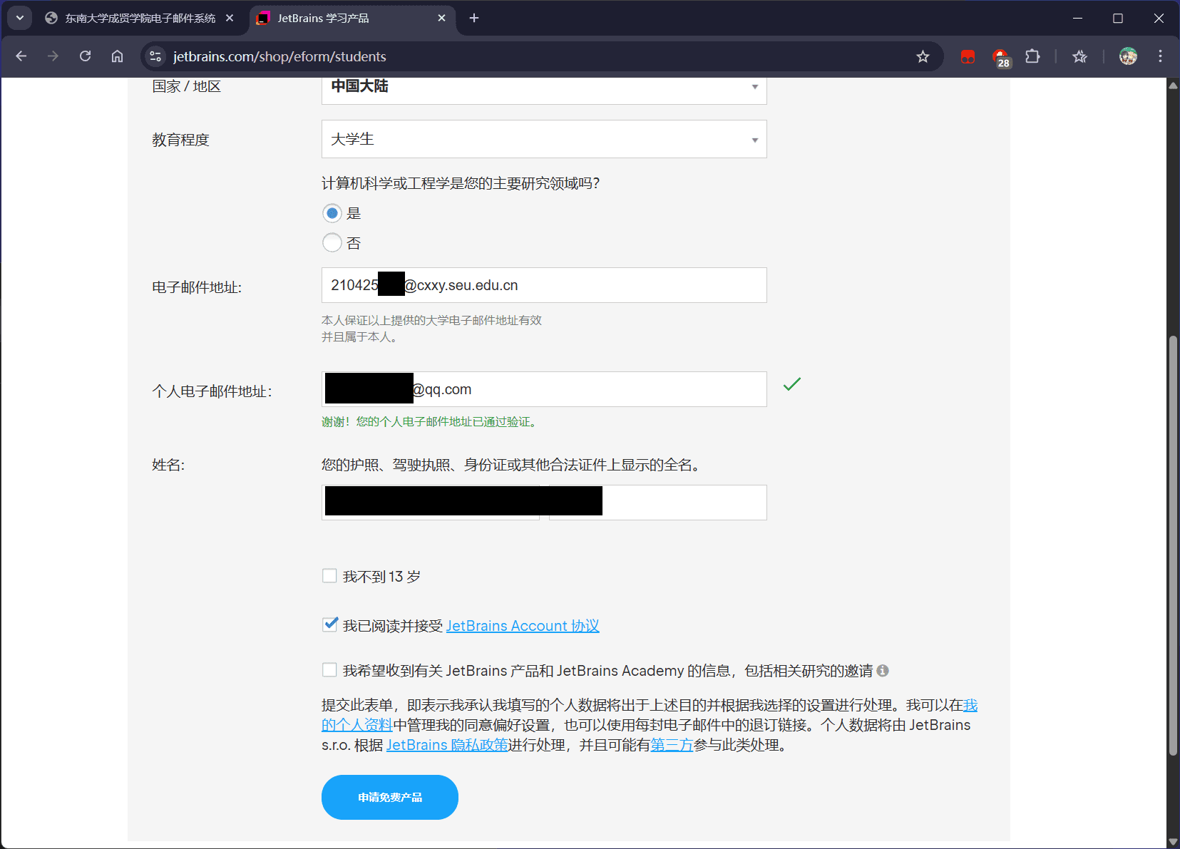 勾选 我已阅读并接受 JetBrains Account 协议(只需要勾选此项,勾选下面一项可能会使你收到垃圾邮件),点击申请免费产品。JetBrains 会向你的学校邮箱中发送验证邮件,回到学校邮箱平台,等待邮件。