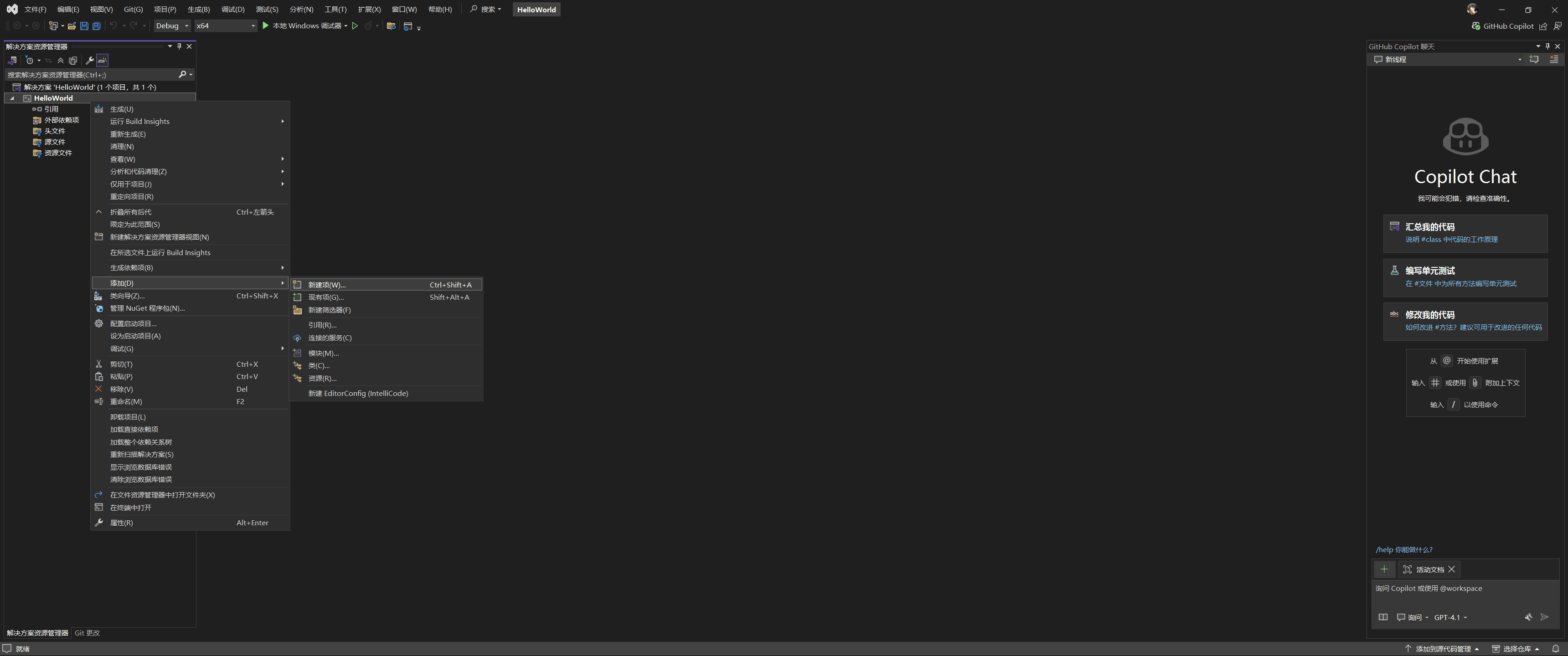 在左侧解决方案界面中,右击你的项目名称,点击 添加 > 新建项。