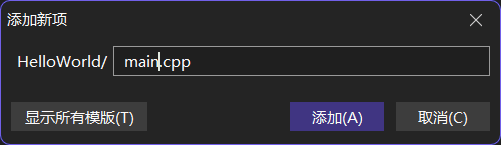 在弹出的对话框中,输入文件名 main.cpp,点击 添加。