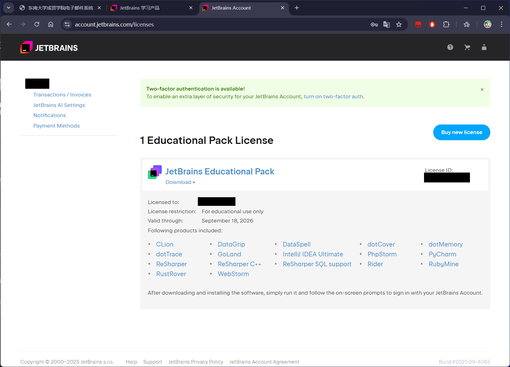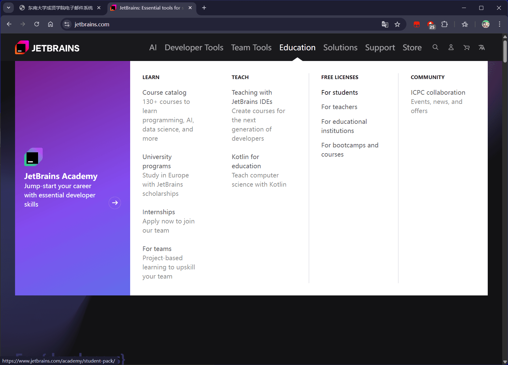 Clion 是 JetBrains 旗下的一款跨平台 C/C++ IDE,功能强大且易于使用。Clion 本身需要付费使用,但是对于学生,JetBrains 提供了免费的学生包,包含 Clion 在内的多款开发工具。作为东南大学成贤学院的学生,我们可以通过学校的教育邮箱来注册。