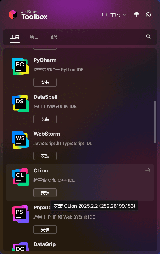 点击左上角 < 工具 返回首页,列表下翻,找到 Clion,点击安装。