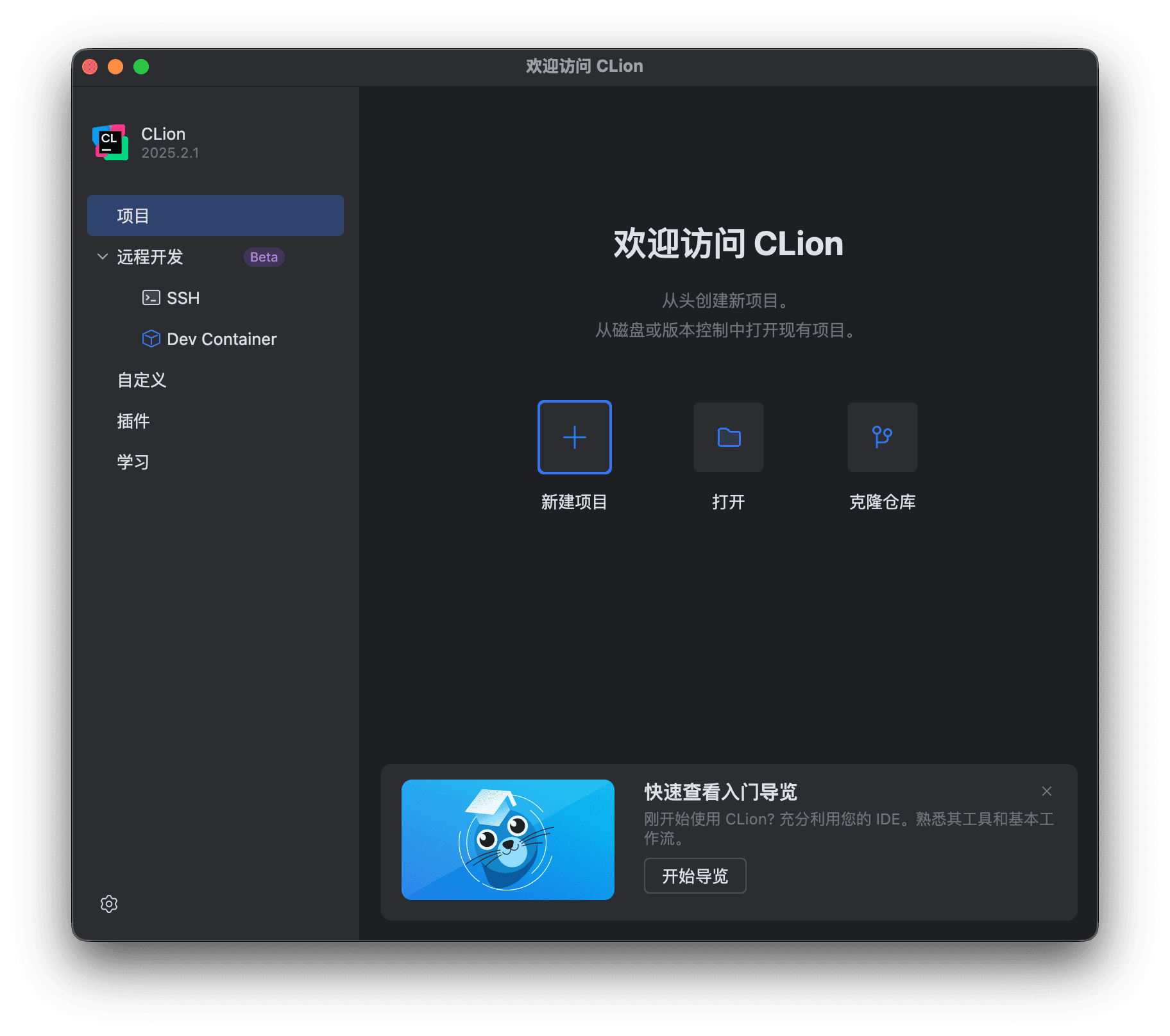 恭喜你已经完成了 Clion 的安装。Clion 默认会带有 MinGW 编译工具链,所以完全可以开箱即用。不过如果需要更新更高级的编译链,请继续查看下一节。