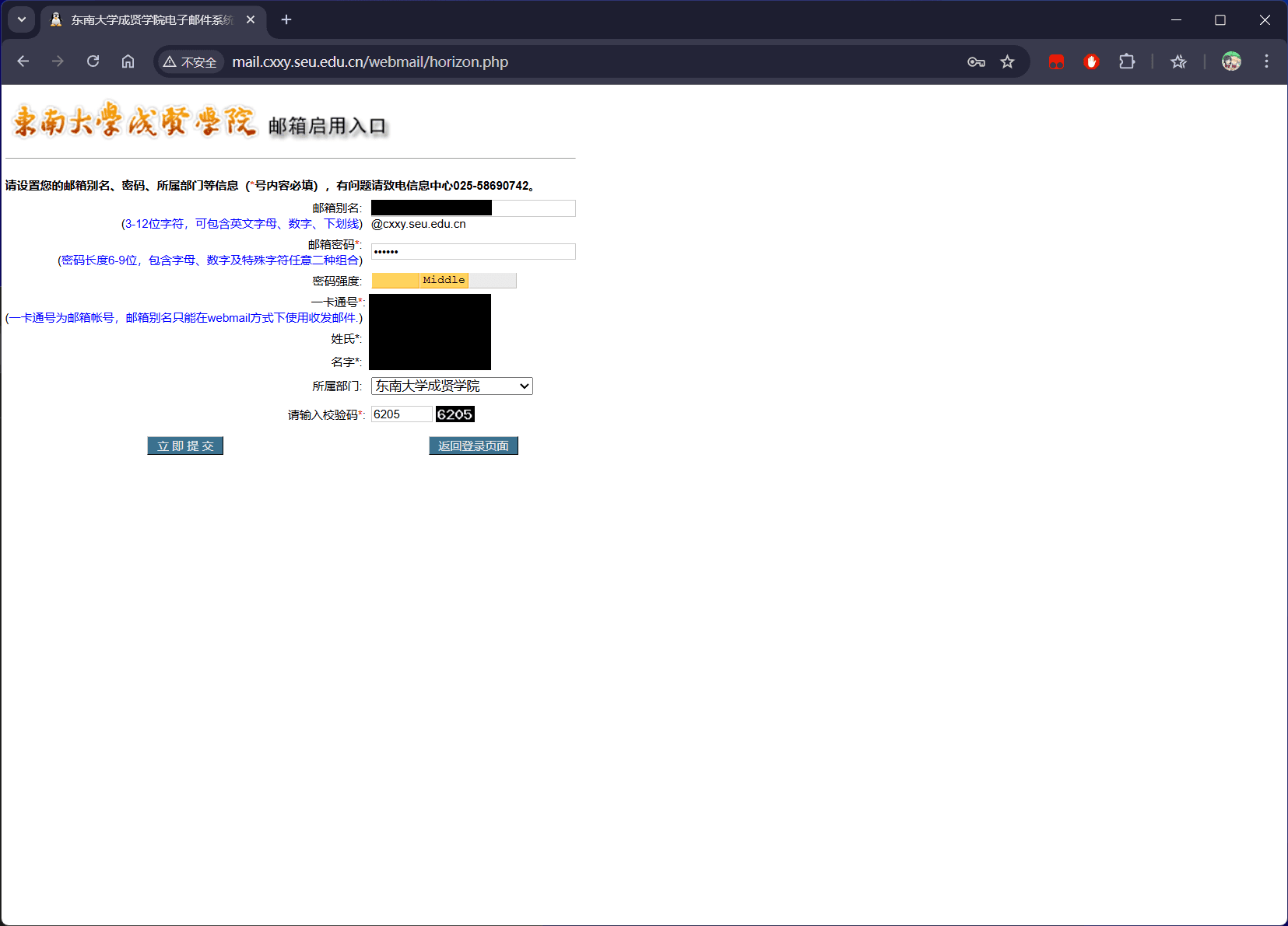 输入邮箱别名(如 caixukun@cxxy.seu.edu.cn,个人建议可以使用自己姓名的拼音)和邮箱密码(使用默认密码即可),输入校验码(PS: 所属部门无需修改),点击立即提交。