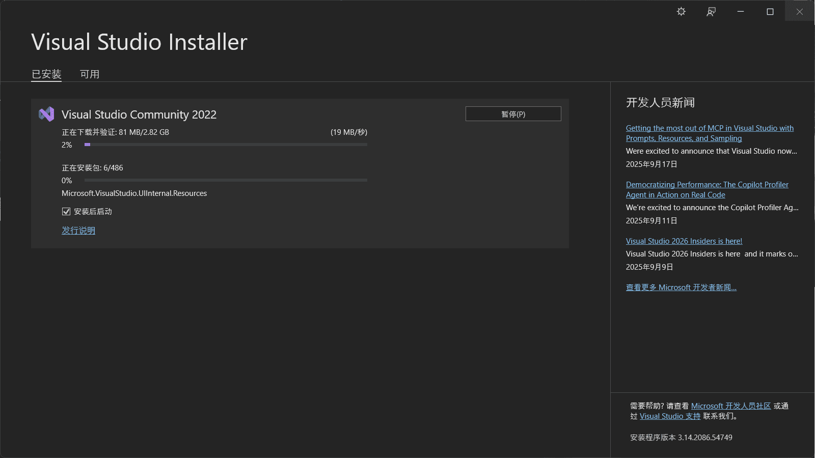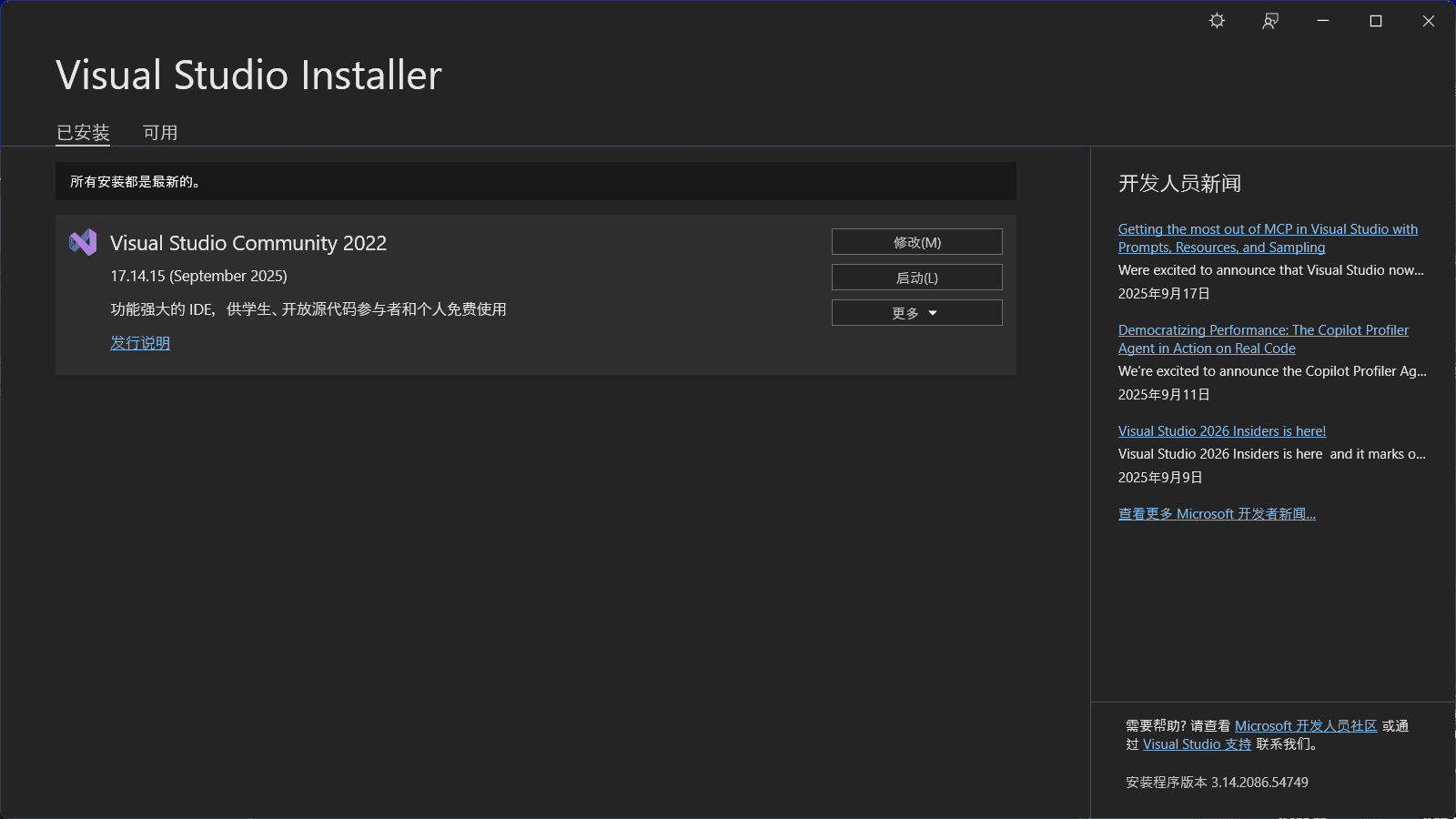 安装 Visual Studio 会消耗大量的磁盘空间,请提前留出空间。Clion 相比 Visual Studio 更加轻量,你可以在上方转到 Clion 安装章节安装 Clion。